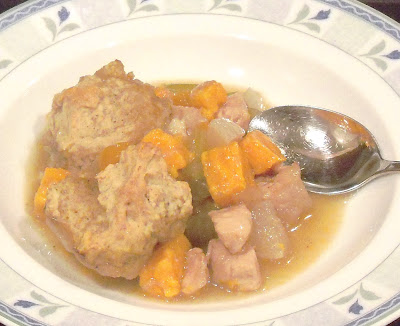 7. In a medium sized bowl, combine flours, baking powder, baking soda, oil, and buttermilk. Stir until combined, and drop by spoonfuls onto the top of the stew.