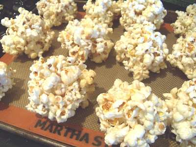 3. Spray hands with cooking spray, and begin to form the popcorn into loosely fashioned balls. Set on wax paper or Silpat until cooled. Wrap with Saran Wrap or place into an air tight container until ready to eat. Stores well for a few days.