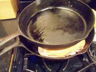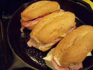 3. Heat a heavy skillet on medium high, coat with butter or olive oil. Place sandwich(es) in skillet, top with another heavy skillet and press down hard.