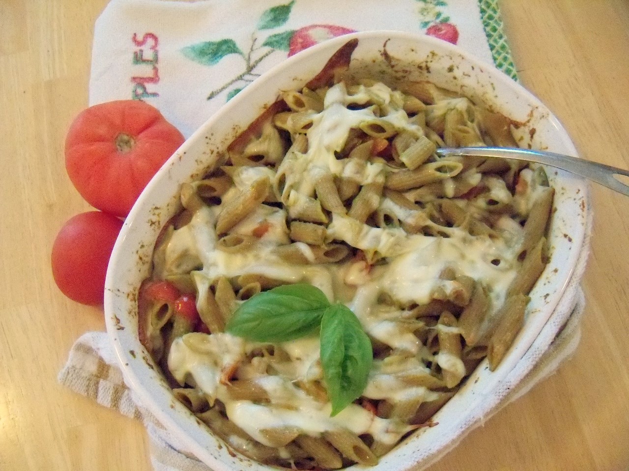 4. When pasta is done cooking, drain. Place pasta into a oven proof casserole dish and toss with tomatoes, and pesto. Top with mozzarella and bake for 15 minutes or until the cheese is melted and the edges become slightly crisp. Let cool slightly. Enjoy!