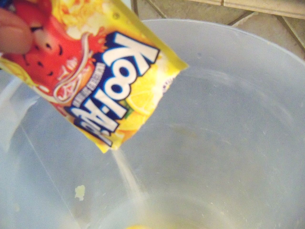 2. Add Kool-Aid, sugar, and water. Stir with a too small spoon.