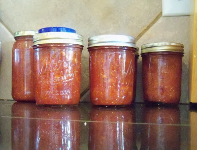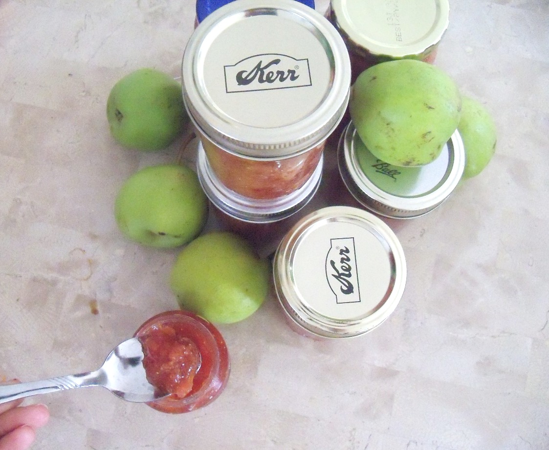 Part of the technique comes from a book Preserving with a Microwave, published in 1991 by Sterling Publishing. The author cooks her pulp in the microwave, which I find more cumbersome than the traditional stove top method. So, I skip that bit. But, I do think it is entirely wonderful that you can find a way to re-use old pickle jars, or jam jars, and can quickly make and can jam without needing all the tools and gadgets which I find costly and burdensome.