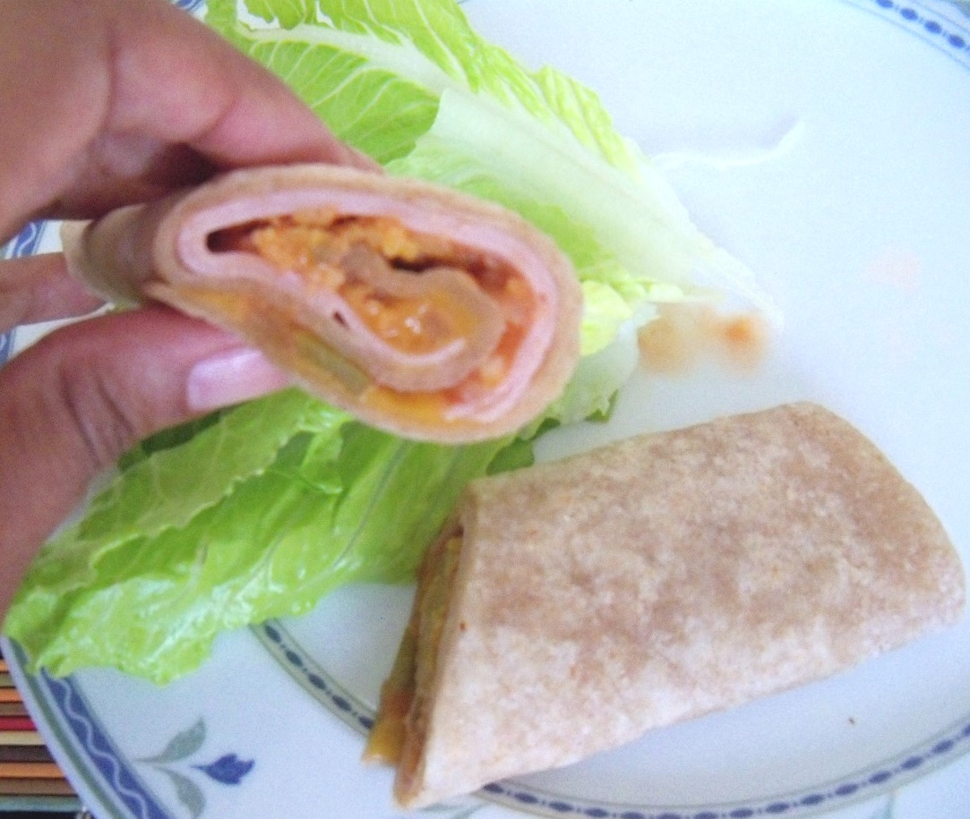 Tortilla Roll-Ups – Turkey, cheese, & Salsa on a Whole Wheat Tortilla microwaved for 20 seconds. Rolled up and served warm.