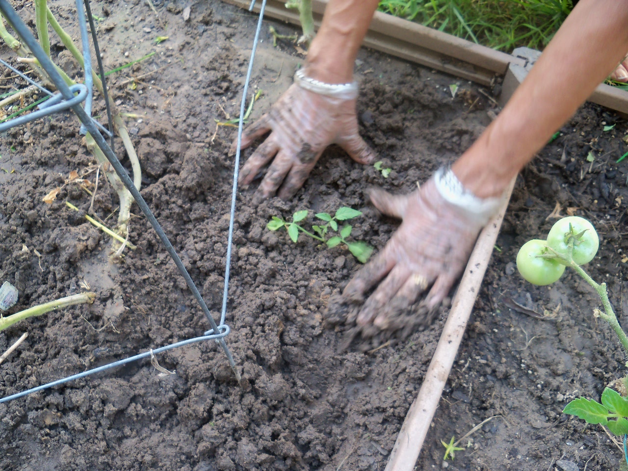 As she tugs on old vines, and replants new ones, tiny cherry tomatoes fall. She carves out a tiny hole for them and covers them up as if it’s a tiny vegetable burial ground. “Why are you doing that?” I lean closer.