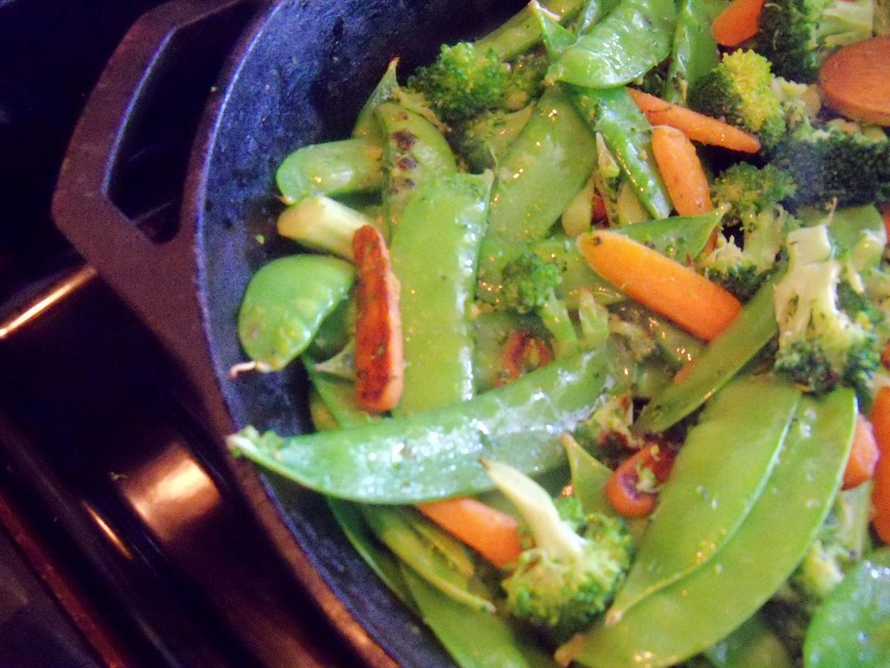 2. To a large skillet, add oil and heat on medium high. Add vegetables. Cover and cook for 3-5 minutes. Remove lid, and cook 3-5 minutes longer. Remove from skillet.