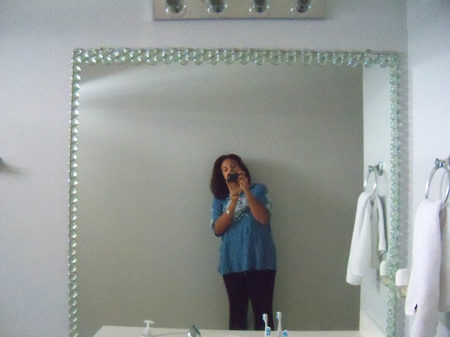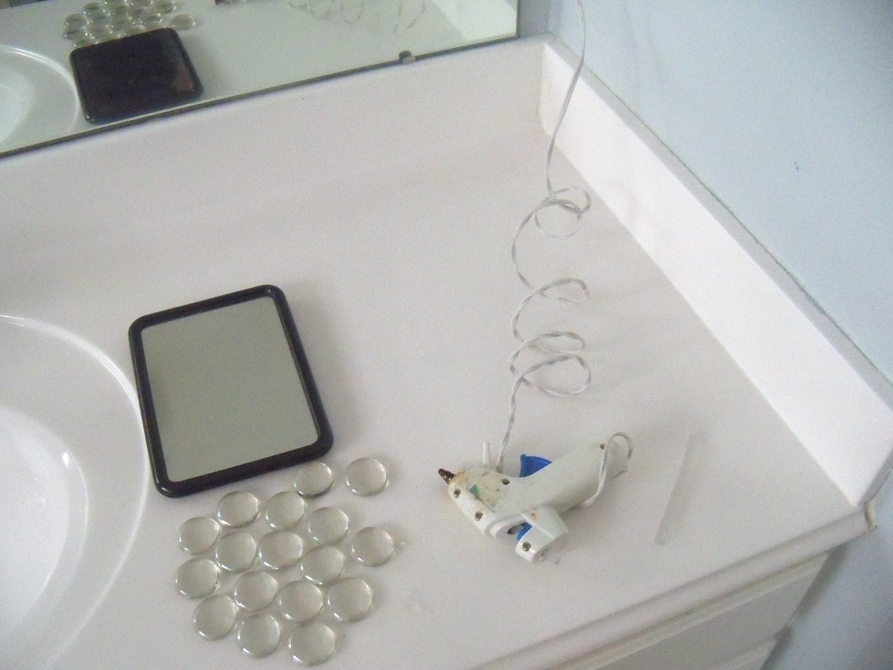 When I told Warwick I was going to GLUE glass stones onto the bathroom mirror, he fainted twice. Okay. Well maybe he didn’t faint, but he did look at me sideways twice, and his face did turn a puke shade of green. Of course, he was worried I’d hurriedly start creating with Super Glue and NO LICK OF SENSE and ruin the mirror, and he’d have to replace it.