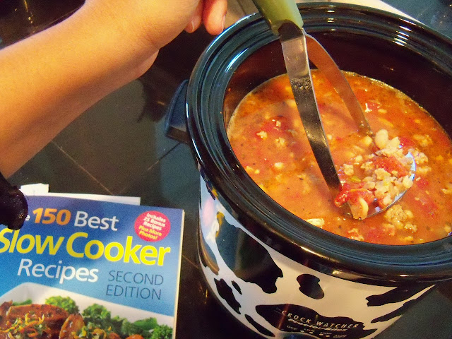 3. Add beans to slow cooker, and pour tomato mixture in as well. Stir to combine. Cover, and cook on low for 6 hours or High for 3 hours. At the end of the allotted time, using a potato masher, mash half of the beans in the pot to make the soup thicker.