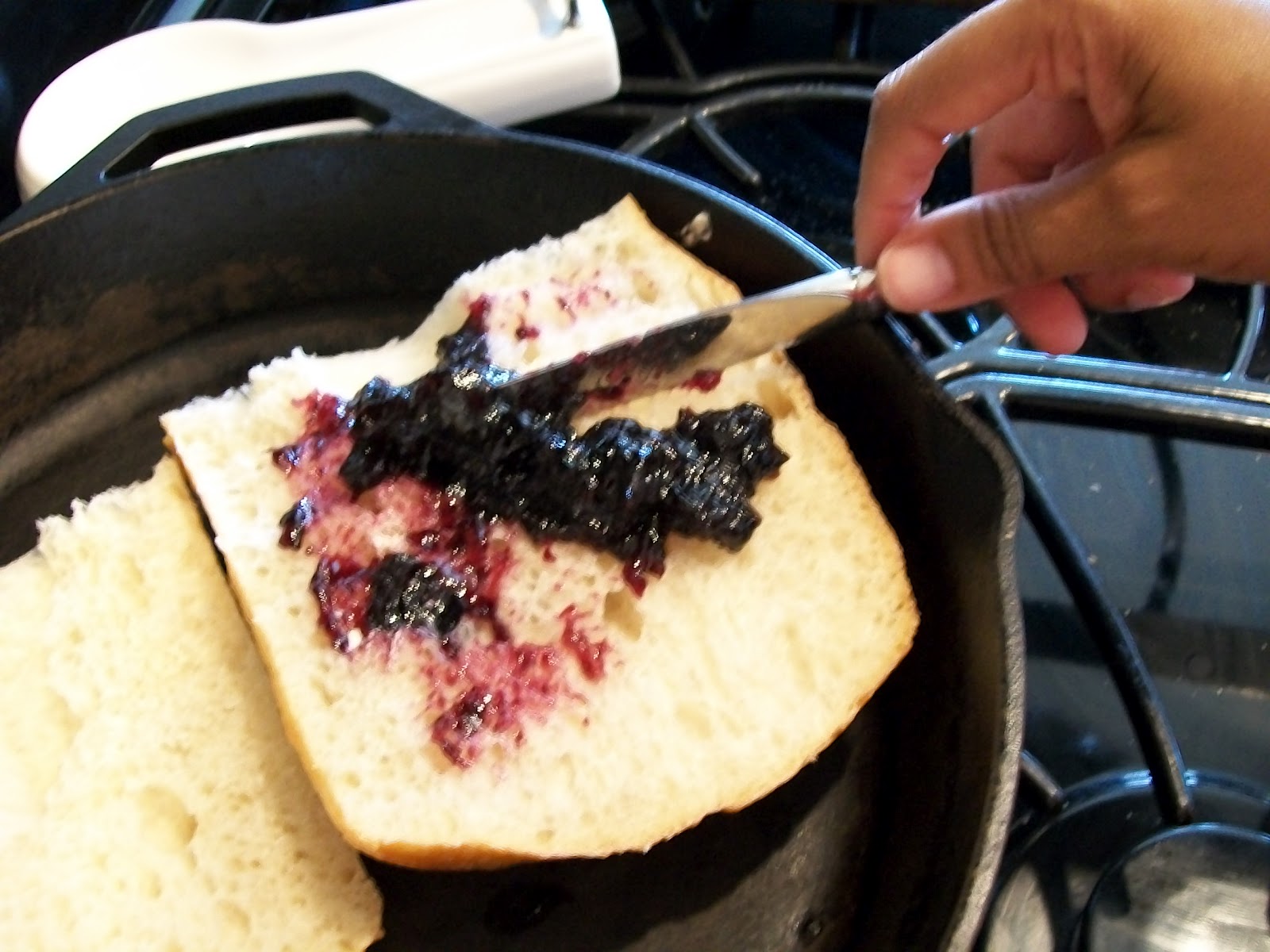 3. Spread blueberry preserves on the inside of the loaf.