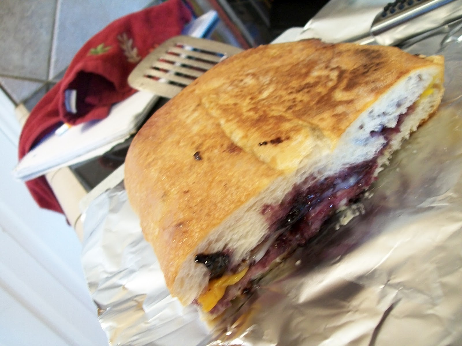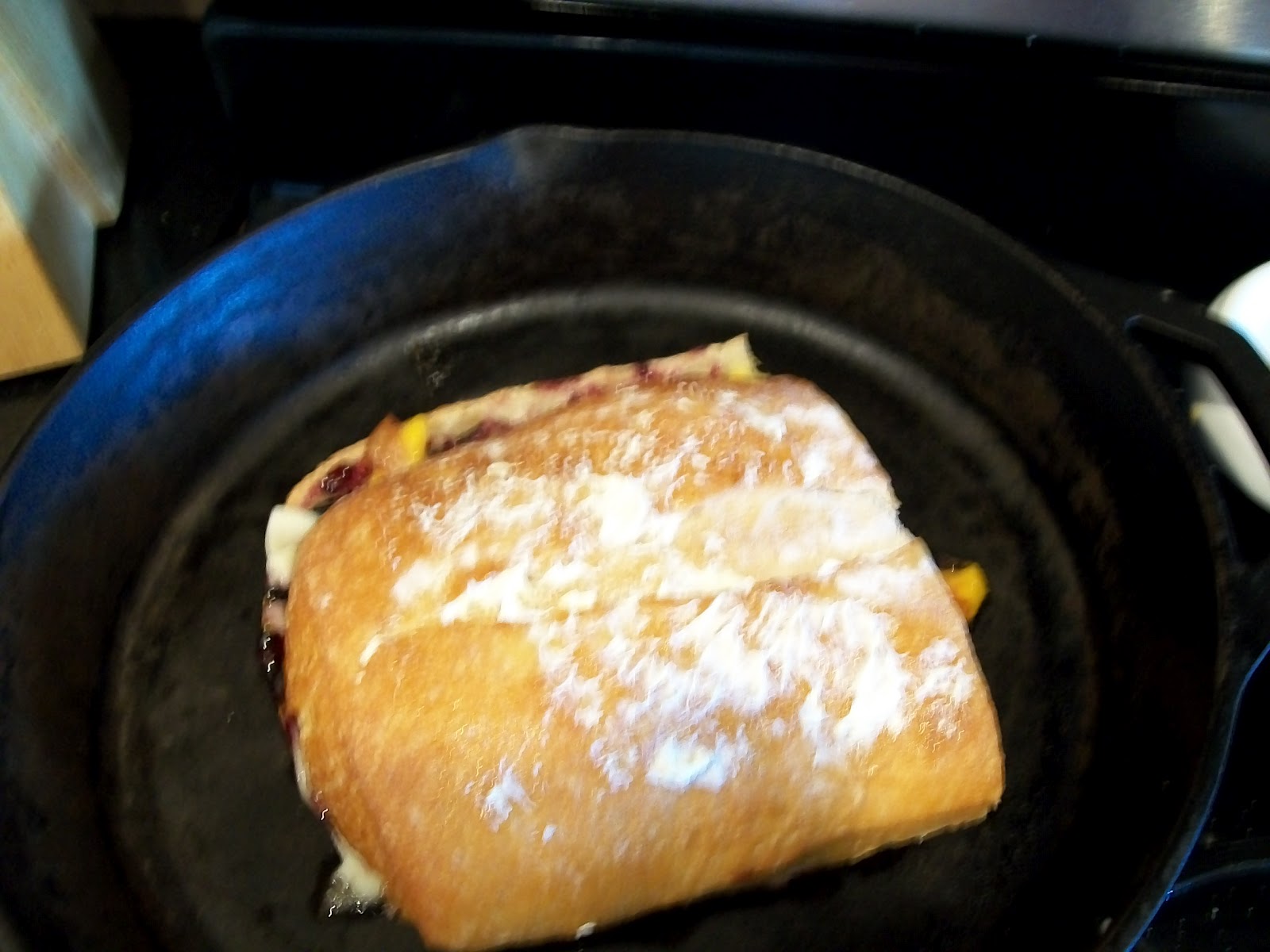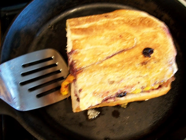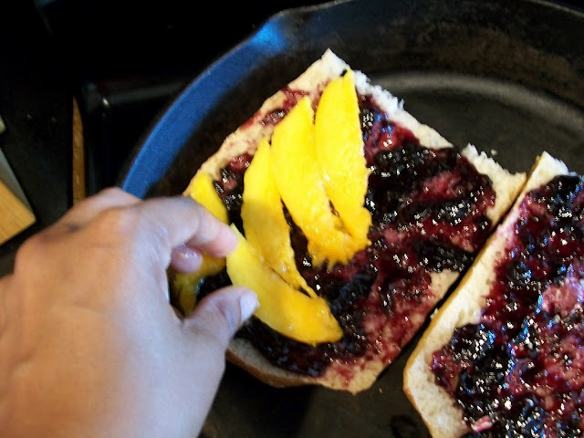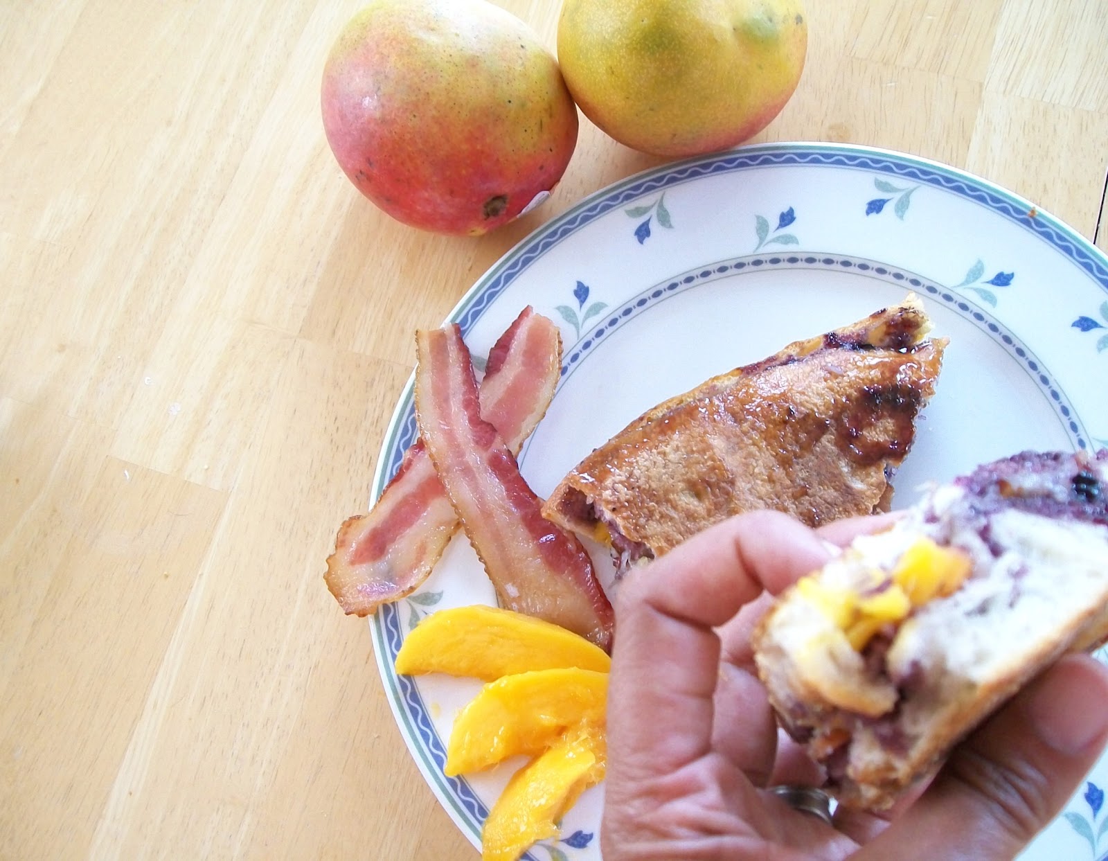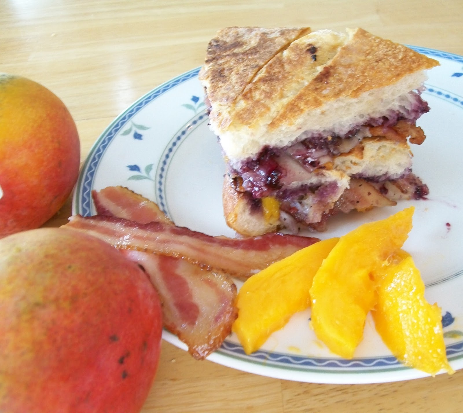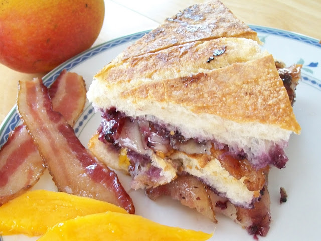 Mixing grilled cheese with sweet mango and blueberries and topping it off with bacon is genius.