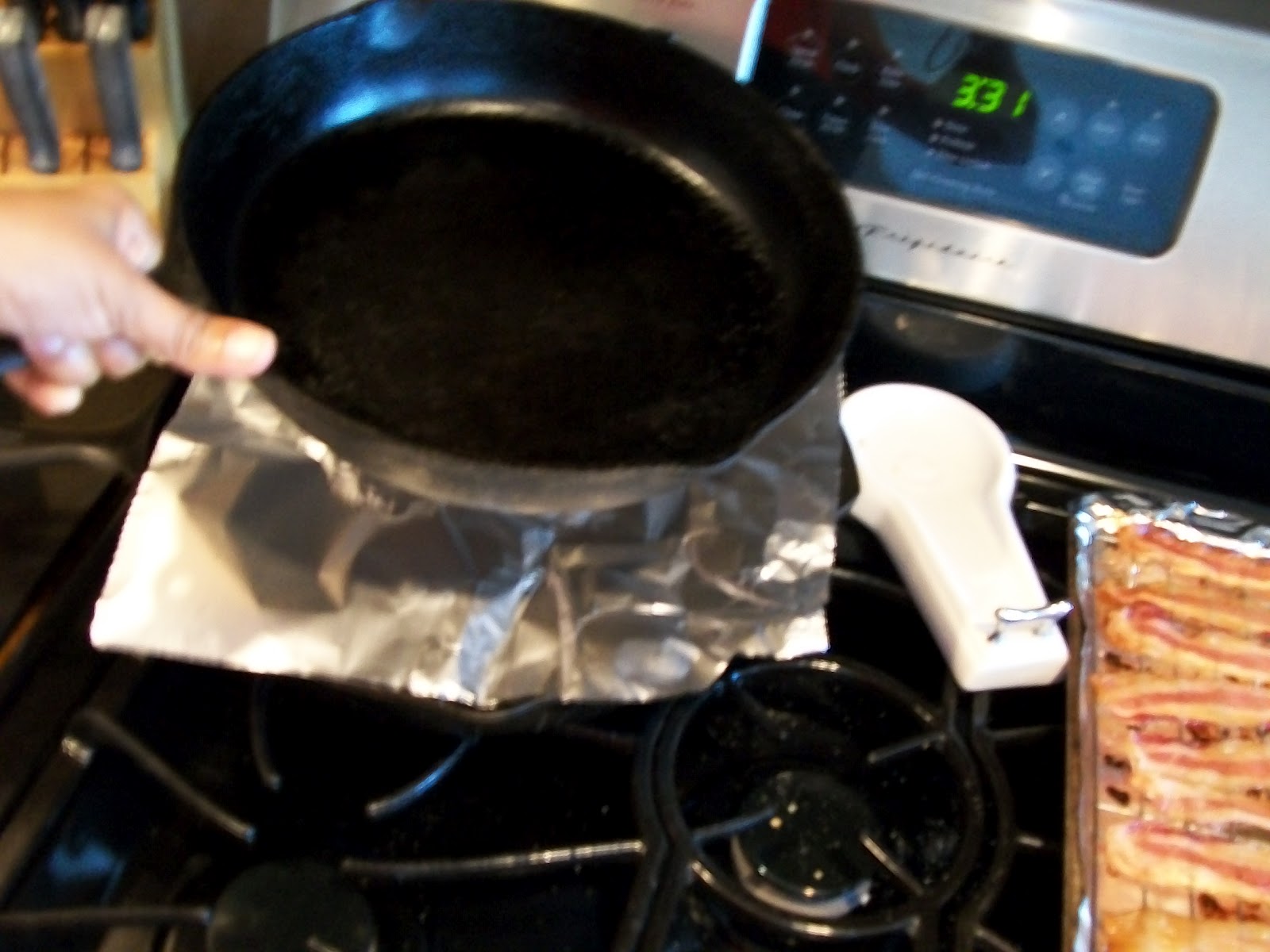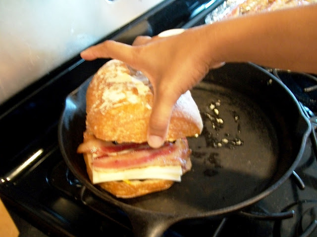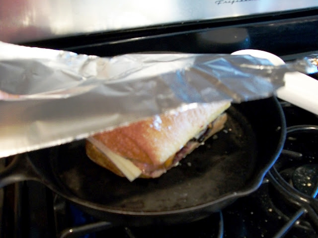 Place top back on, and place in your skillet. Press down. Cover with a sheet of aluminum foil and another heavy skillet. Press down again.