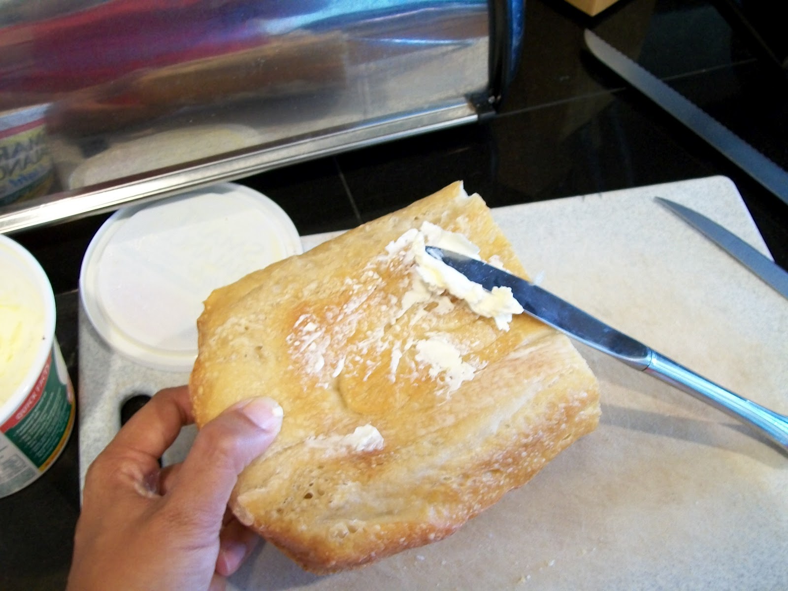 2. Butter the tops and the bottoms of the outer sides of the bread loaf.