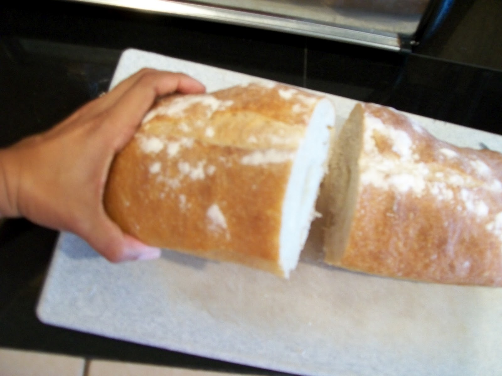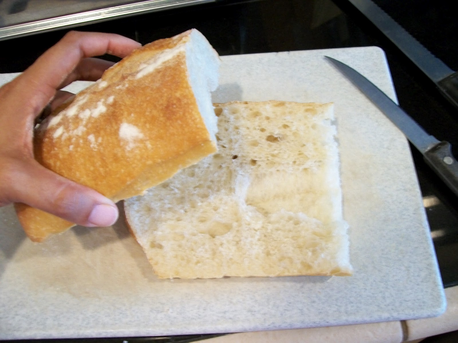 1. Cut the Ciabatta Loaf in half, and then again lengthwise. (This will allow you to fit it into the pan).