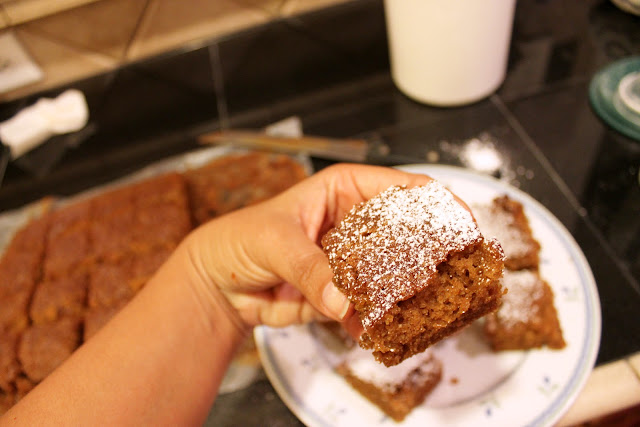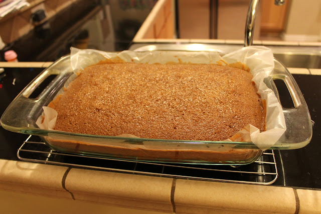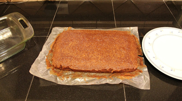5. Pour the mixture into the pan and bake for about 45 minutes or until it is completely risen, pulling away from the sides and slightly springy. Remove from oven and let cool before cutting into squares.