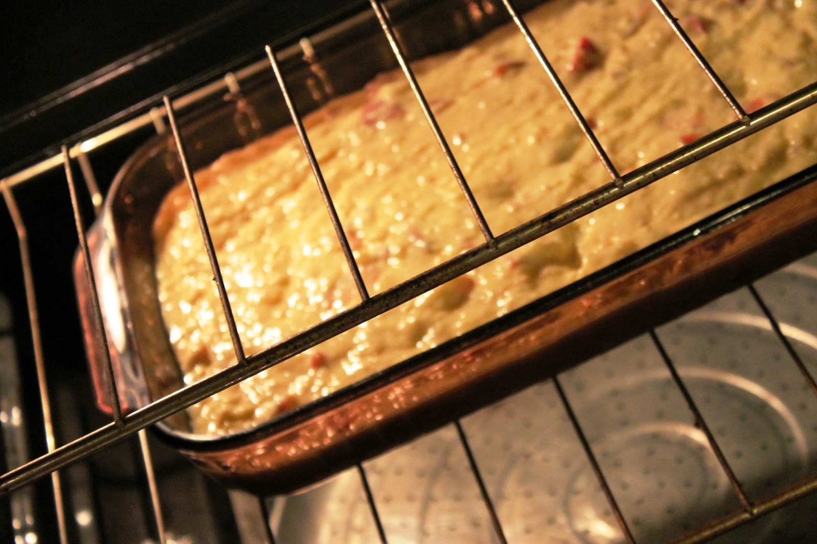 Pour batter into a 9 by 13 inch baking dish and bake in preheated oven for 35 to 40 minutes until the top of cake is golden brown. Remove from oven, cool and serve.