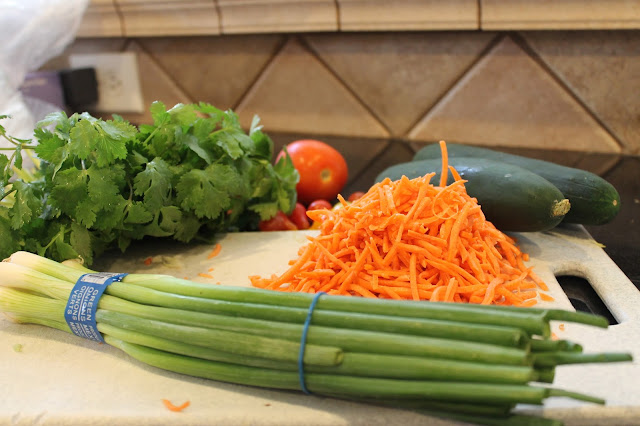 2. Gather Cilantro, tomatoes, carrots, green onion, and cucumbers. Chop into bite size pieces. Place in a medium container with a top! This makes it better for storing leftovers in the fridge. It prevents the leaves from getting soggy:)